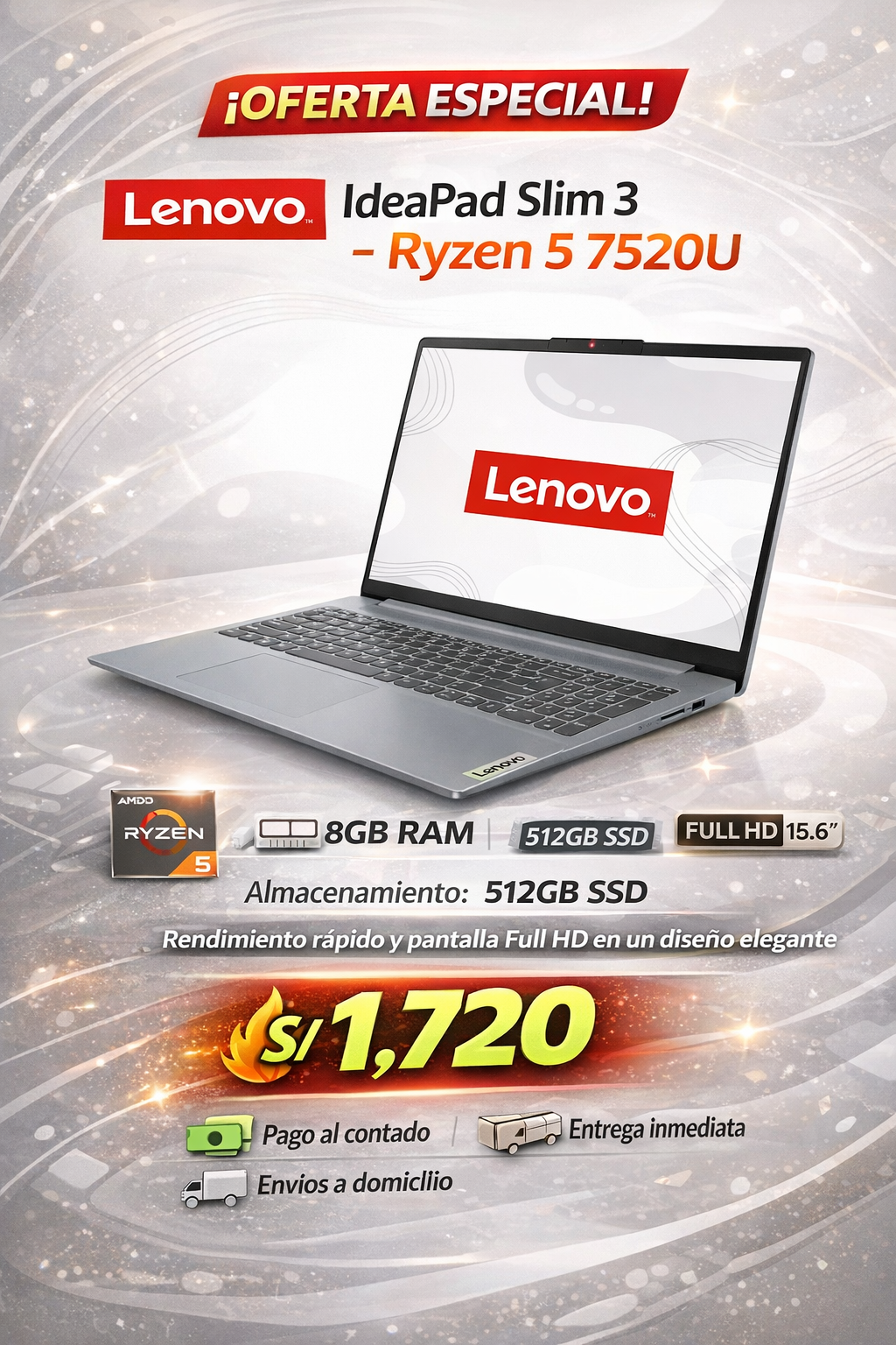 Lenovo IdeaPad Slim 3 – Ryzen 5 7520U, 8GB RAM | 512GB SSD, Pantalla Full HD 15.6″