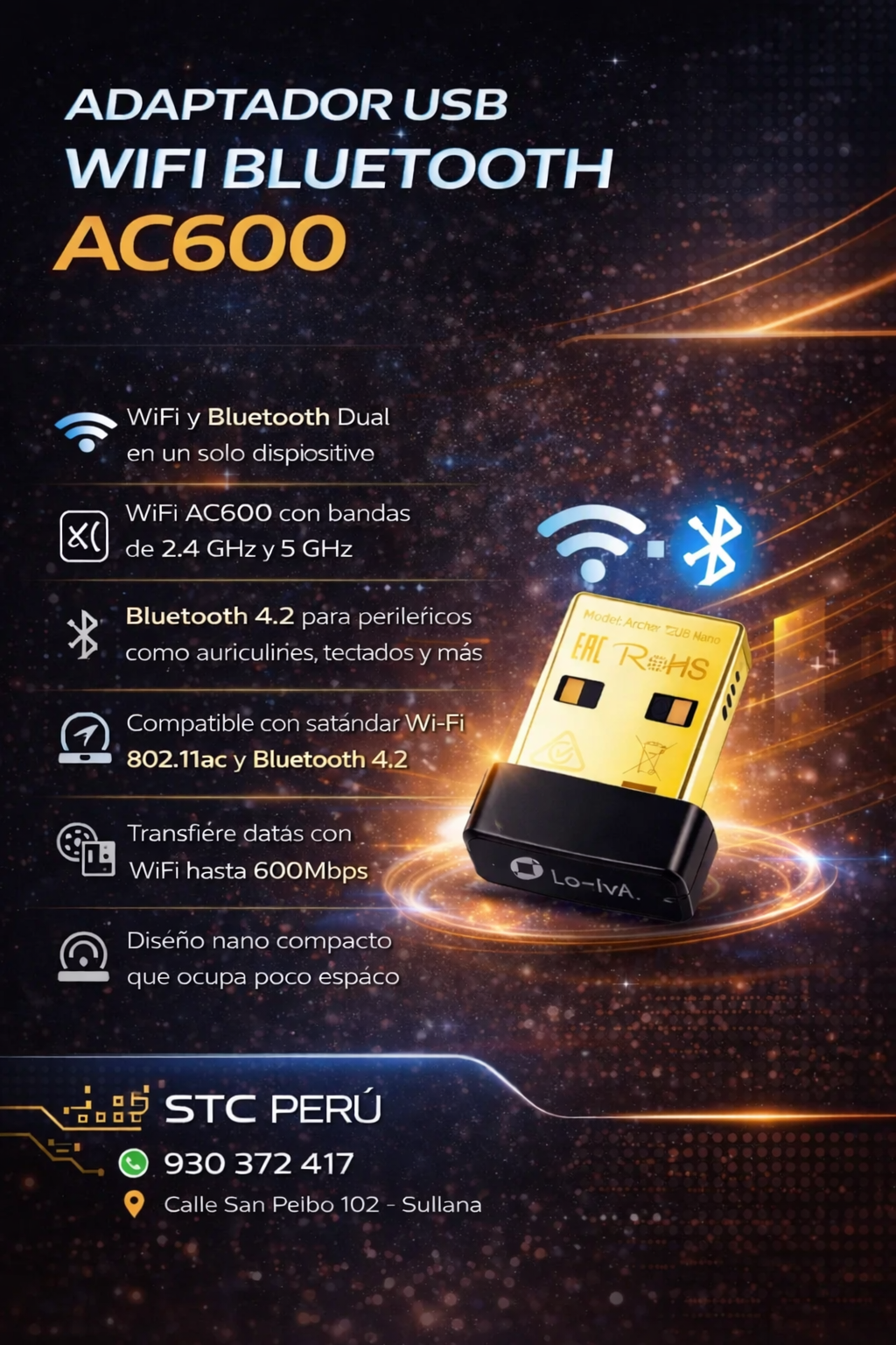 Adaptador USB WiFi + Bluetooth AC600 que permite conectar tu computadora a redes inalámbricas y dispositivos Bluetooth.