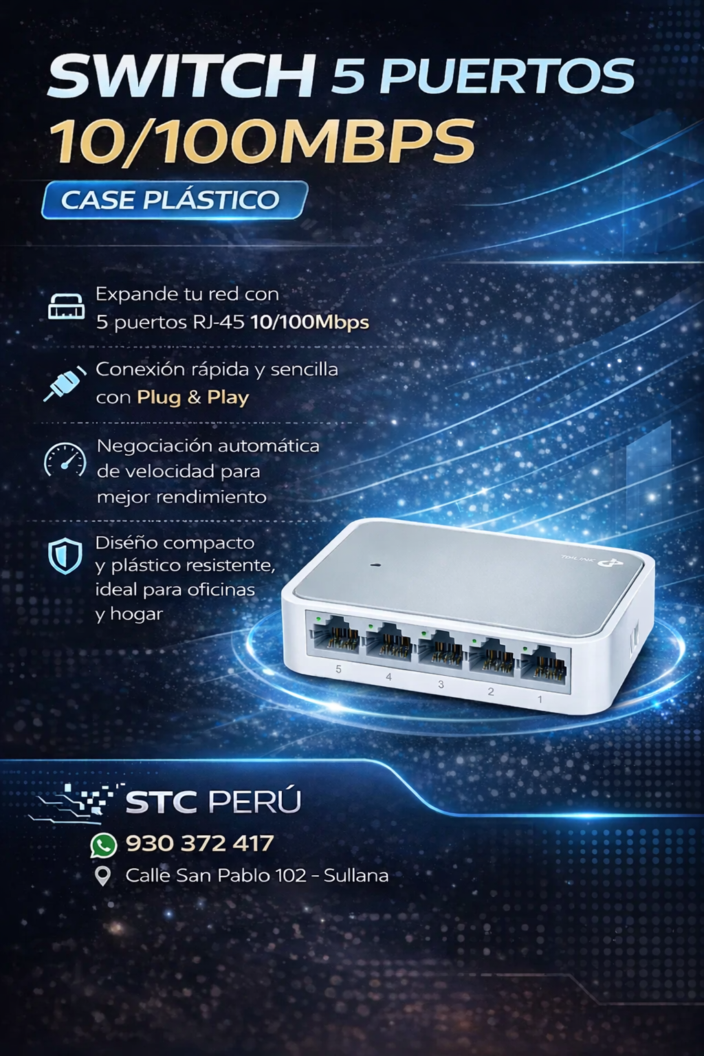 Switch de red de 5 puertos 10/100 Mbps para expandir conexiones de red de manera rápida y sencilla.